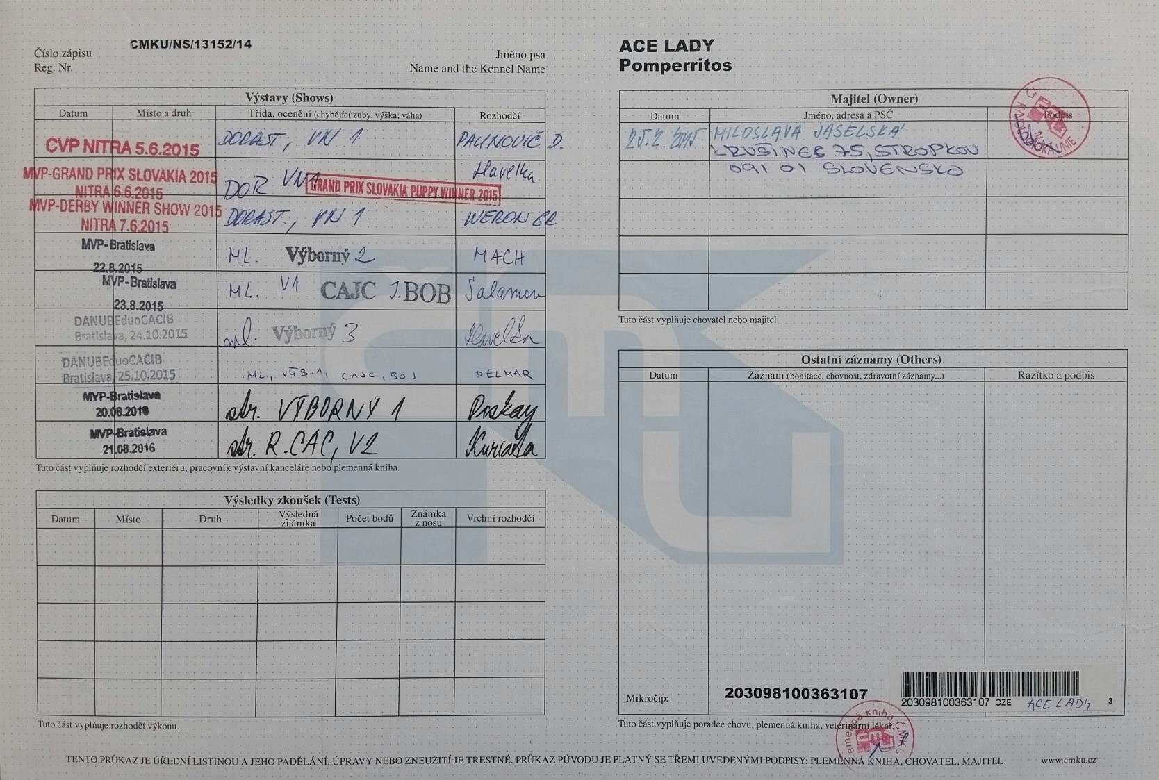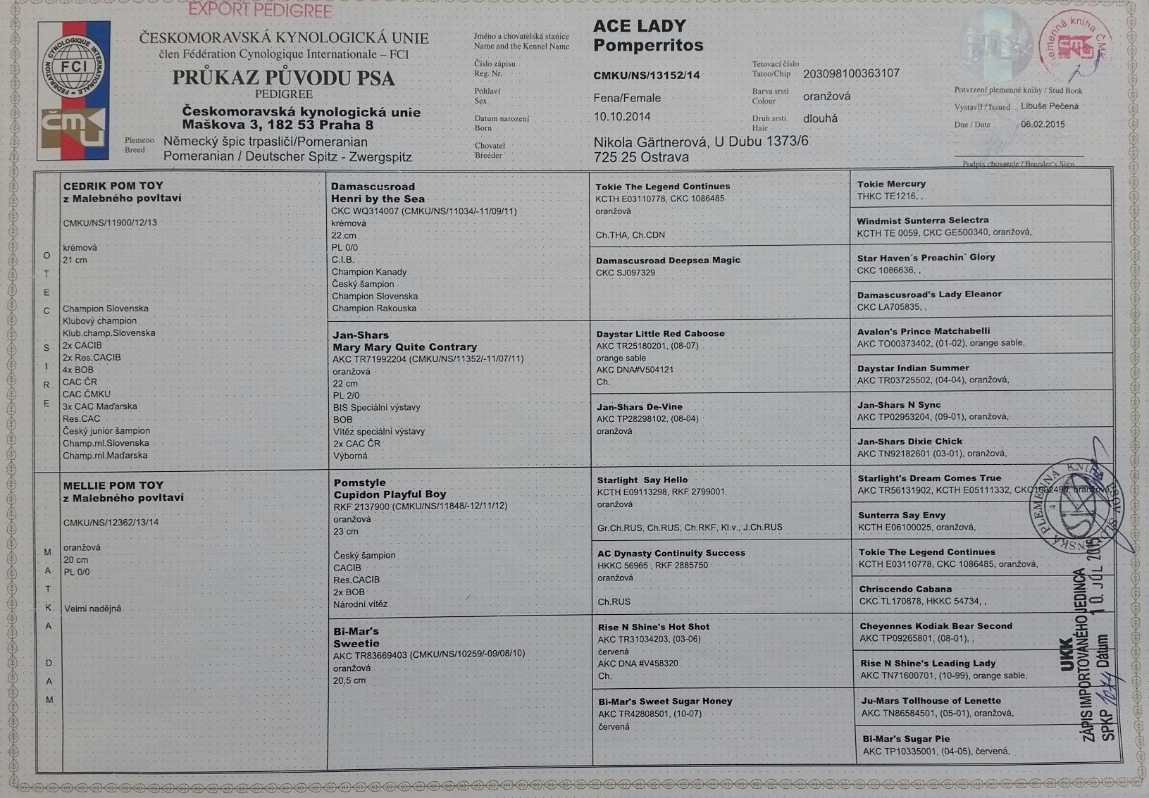 Preukaz pôvodu psa - 2. strana: