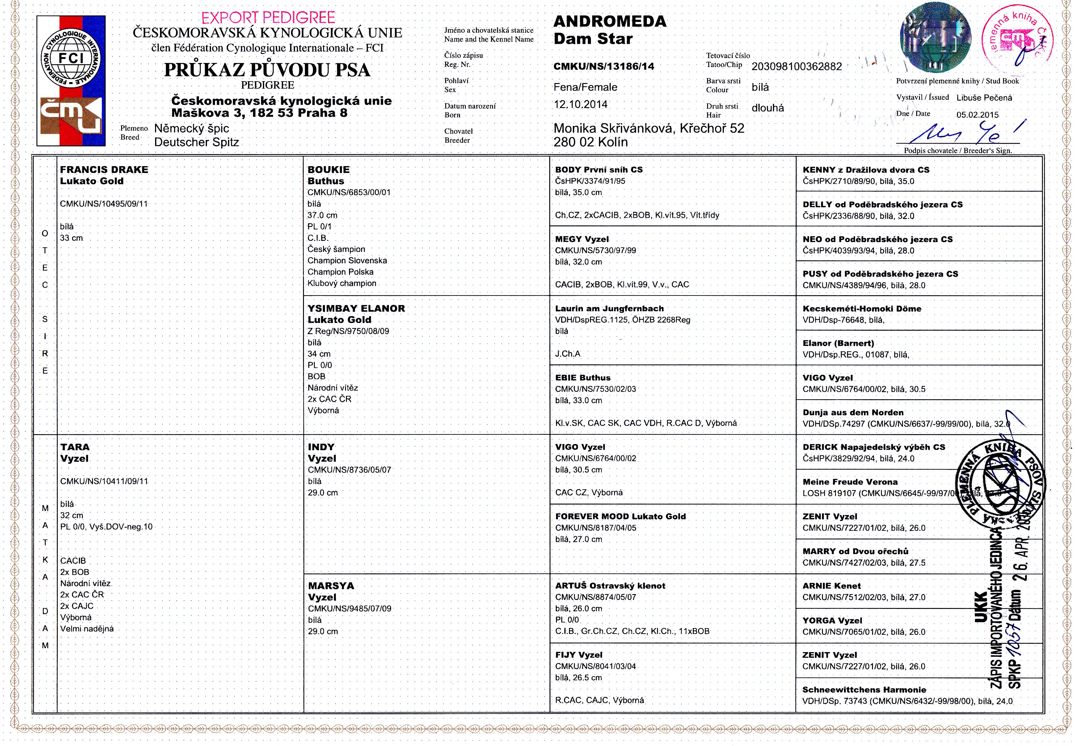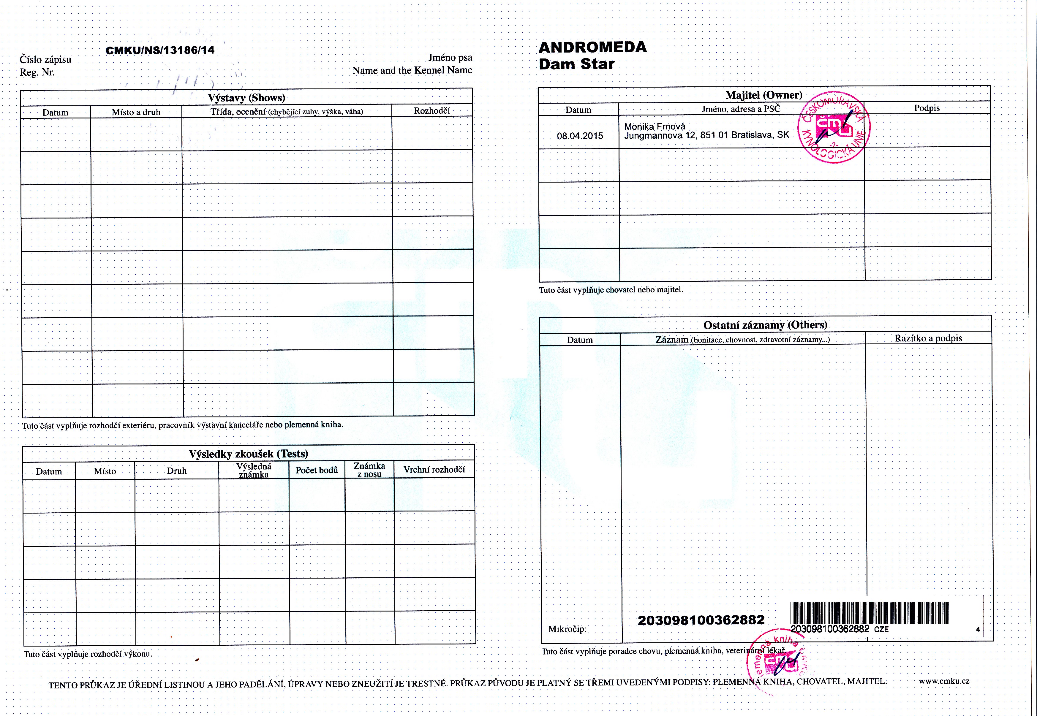 Preukaz pôvodu psa - 2. strana: