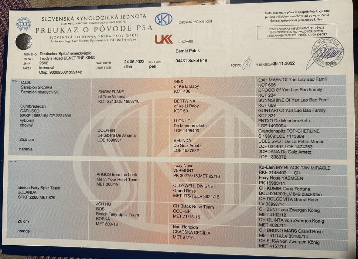 Preukaz pôvodu psa - 1. strana: