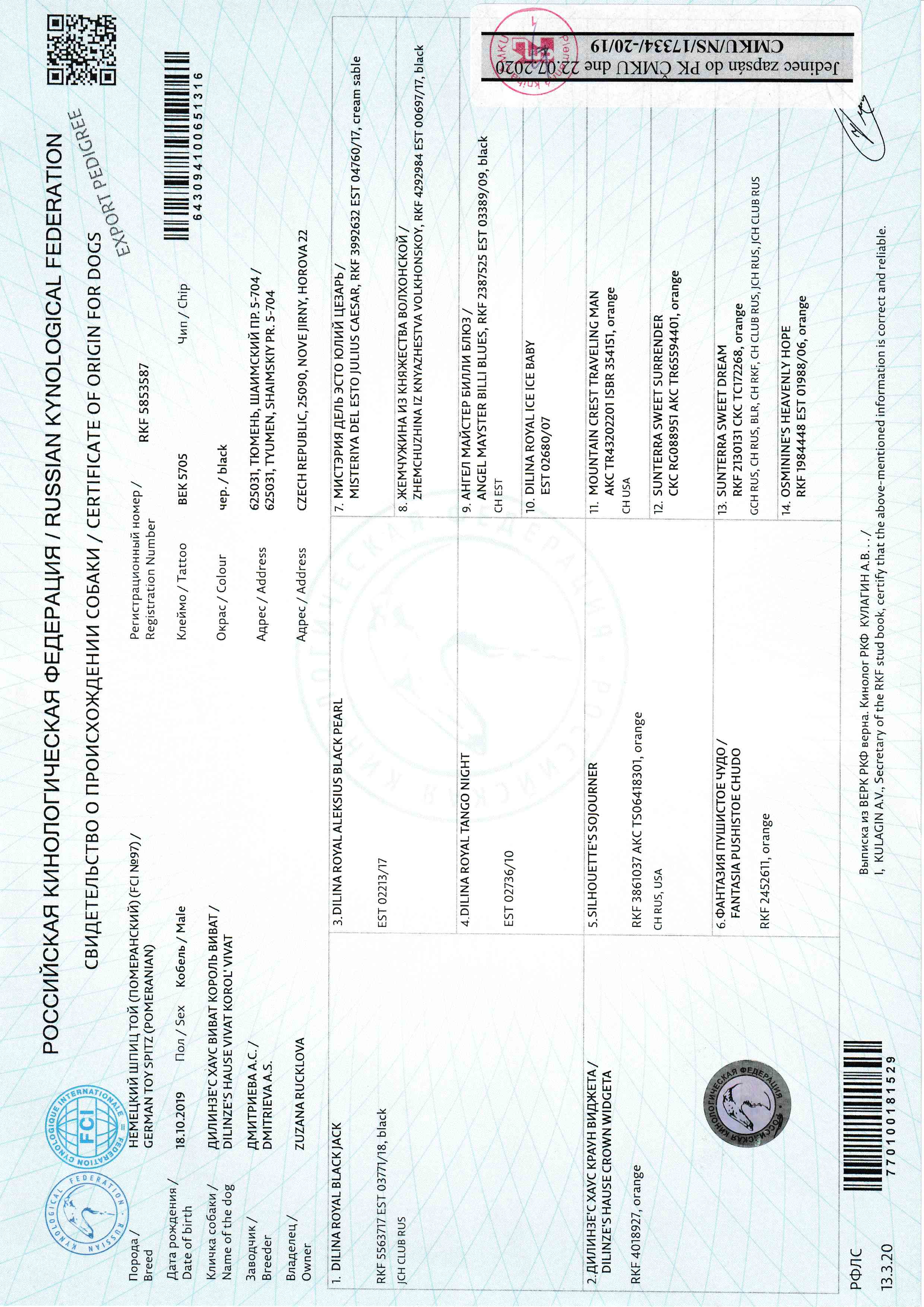 Preukaz pôvodu psa - 1. strana: