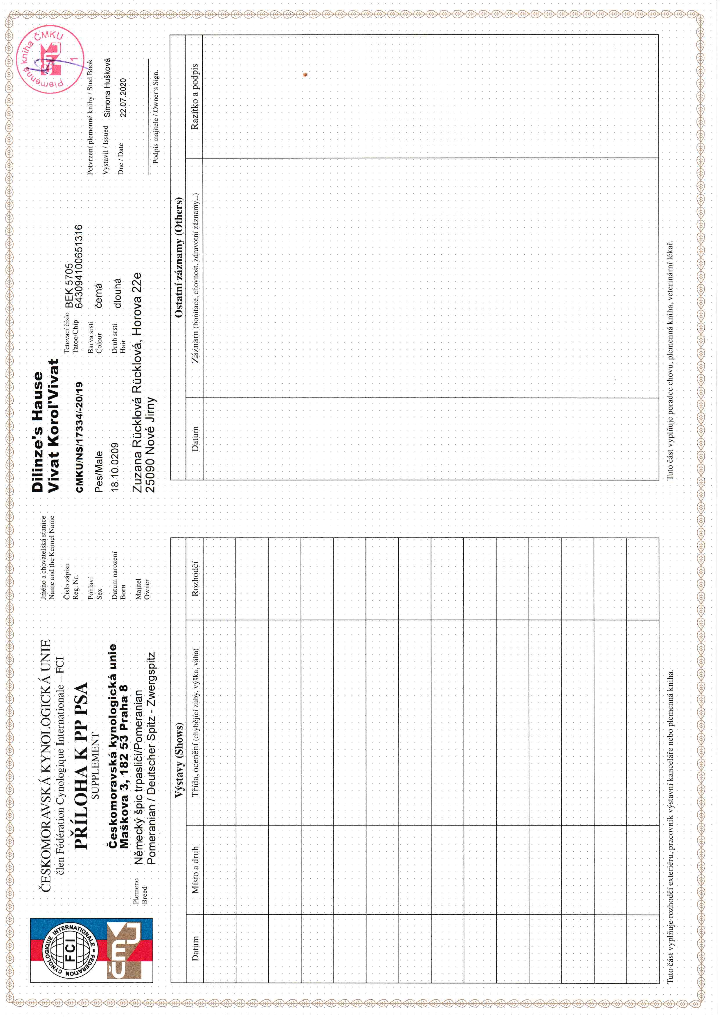 Preukaz pôvodu psa - 2. strana: