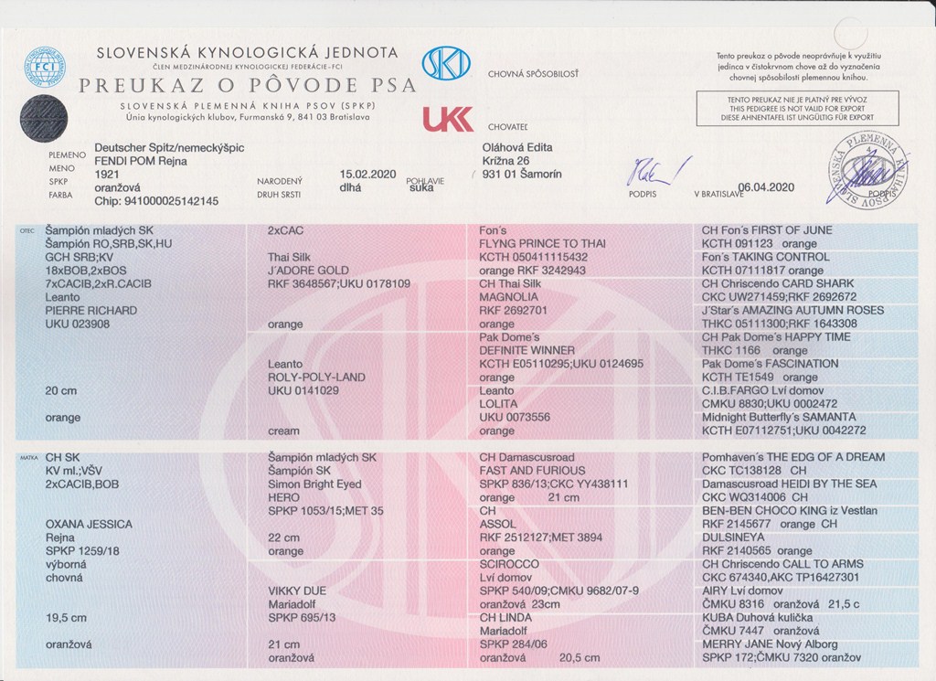 Preukaz pôvodu psa - 1. strana: