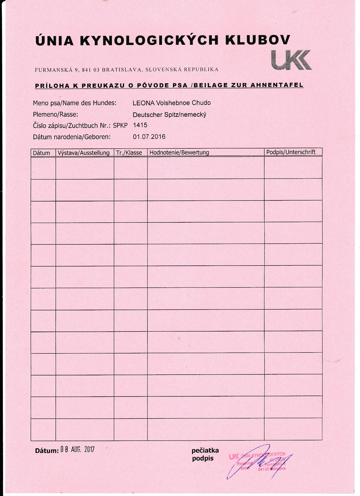 Preukaz pôvodu psa - 1. strana: